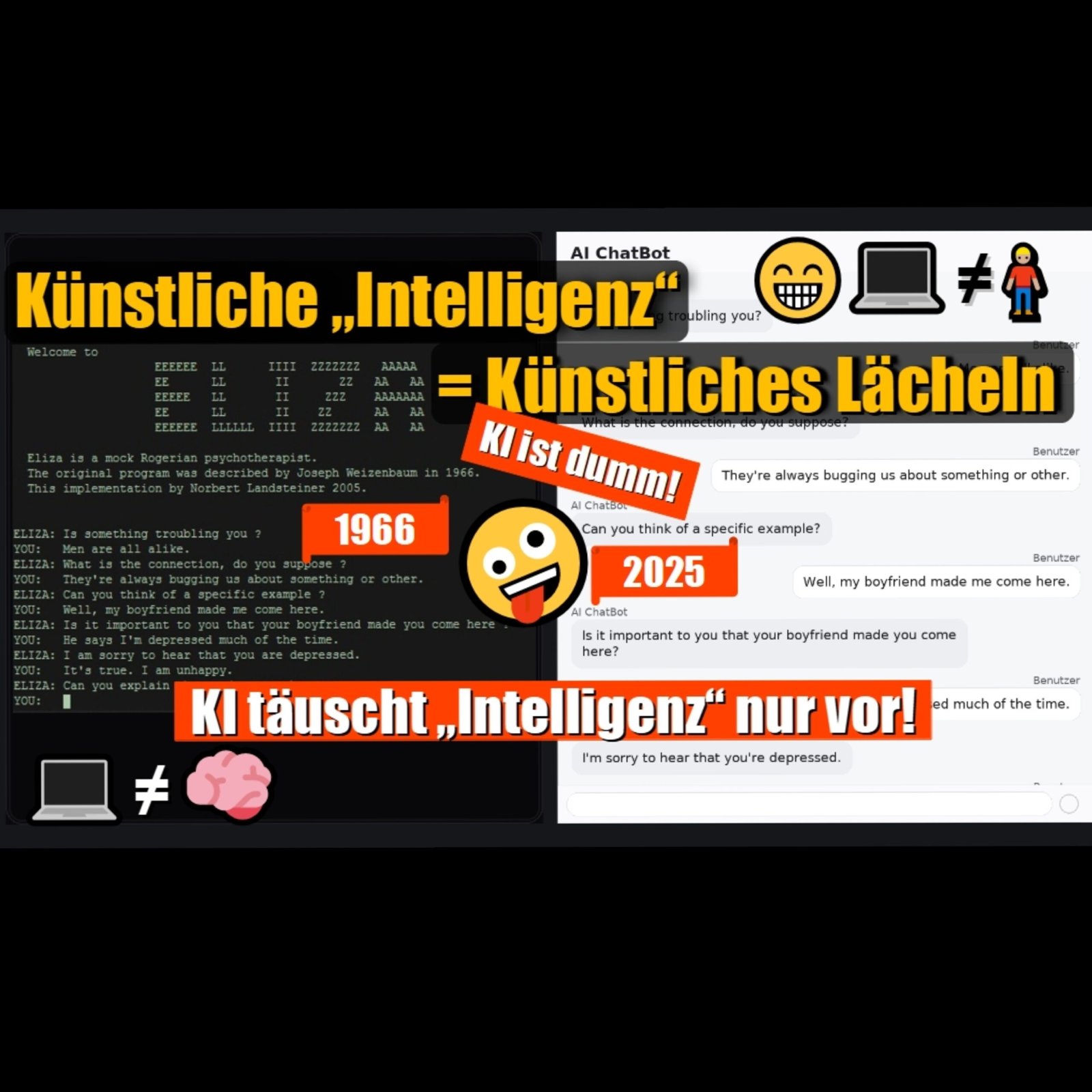 • weshalb Turing-Test & ELIZA täuschen – und moderne Chatbots dasselbe Prinzip perfektionieren