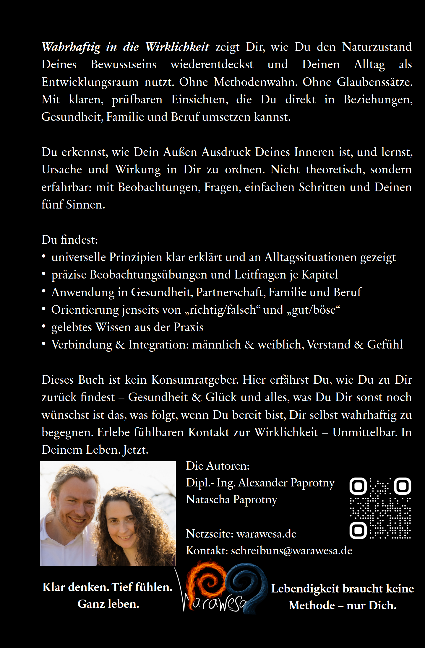 - Männlich & weiblich integriert. Struktur & Klarheit verbinden sich mit Spüren & Empfänglichkeit. Hinter dem Buch stehen zwei ungewöhnliche, völlig unterschiedliche Lebenswege und ein breitbandig vernetztes Wissensspektrum – für Dich destilliert.